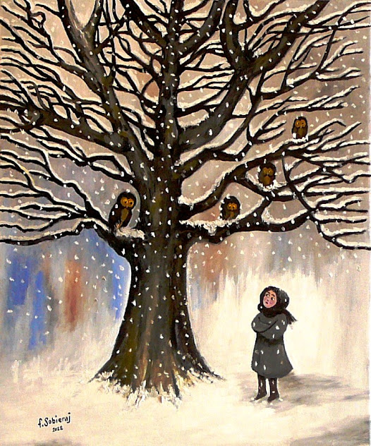 "Chouettes sous la neige", huile sur toile 55x46 cm